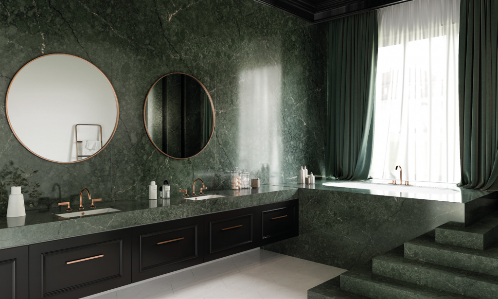 Wer heute ein Badezimmer plant, denkt längst nicht mehr nur funktional, sondern in ganzheitlichen Raumkonzepten. Aus der Nasszelle wird so ein persönliches Refugium – für manche gar ein Tempel des Wohlbefindens, wo man erfrischt in den Tag startet und nach vollbrachten Taten wieder zur Ruhe kommt. Materialien bestimmen die Atmosphäre, Haptik und Langlebigkeit. Mit Dekton® und Silestone® bietet Cosentino Hightech- Werkstoffe für ästhetische, fugenarme Böden, Möbel- und Wandverkleidungen sowie Waschbecken und Duschtassen. Sie vereinen den nachhaltigen Charakter von Stein mit großer Designfreiheit und Pflegeleichtigkeit.